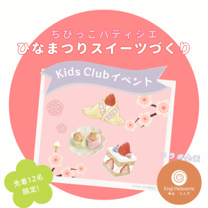 今月のキッズクラブイベントはすぐに満員となる人気イベントです! ひなまつりをモチーフにパティシエ体験をしましょう。 ぜひ、ご参加ください!